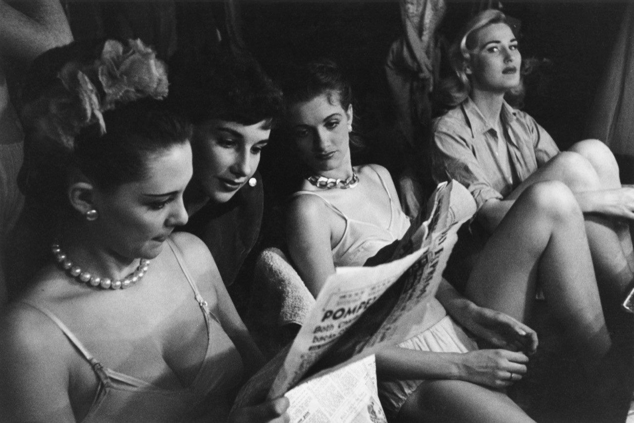 Image: Bluebell Girls from London read the paper during an interval at the Lido club in the Champs-Elysees, Paris, November 1951. They are en route to Italy. Original Publication: Picture Post - 5672 (9 February 1952) - Miss Bluebell Takes Her Girls To Italy. Photo by Grace Robertson/Picture Post/Hulton Archive/Getty Images.