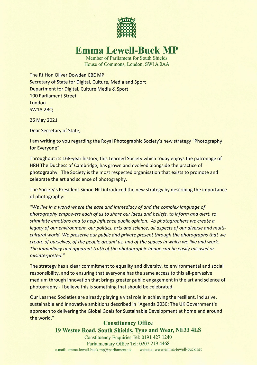 Emma Lewell-Buck, MP for South Shields, has asked the Secretary of State of Culture, Media and Sport, Oliver Dowden, to congratulate both the RPS and its President, Simon Hill HonFRPS on their achievements.