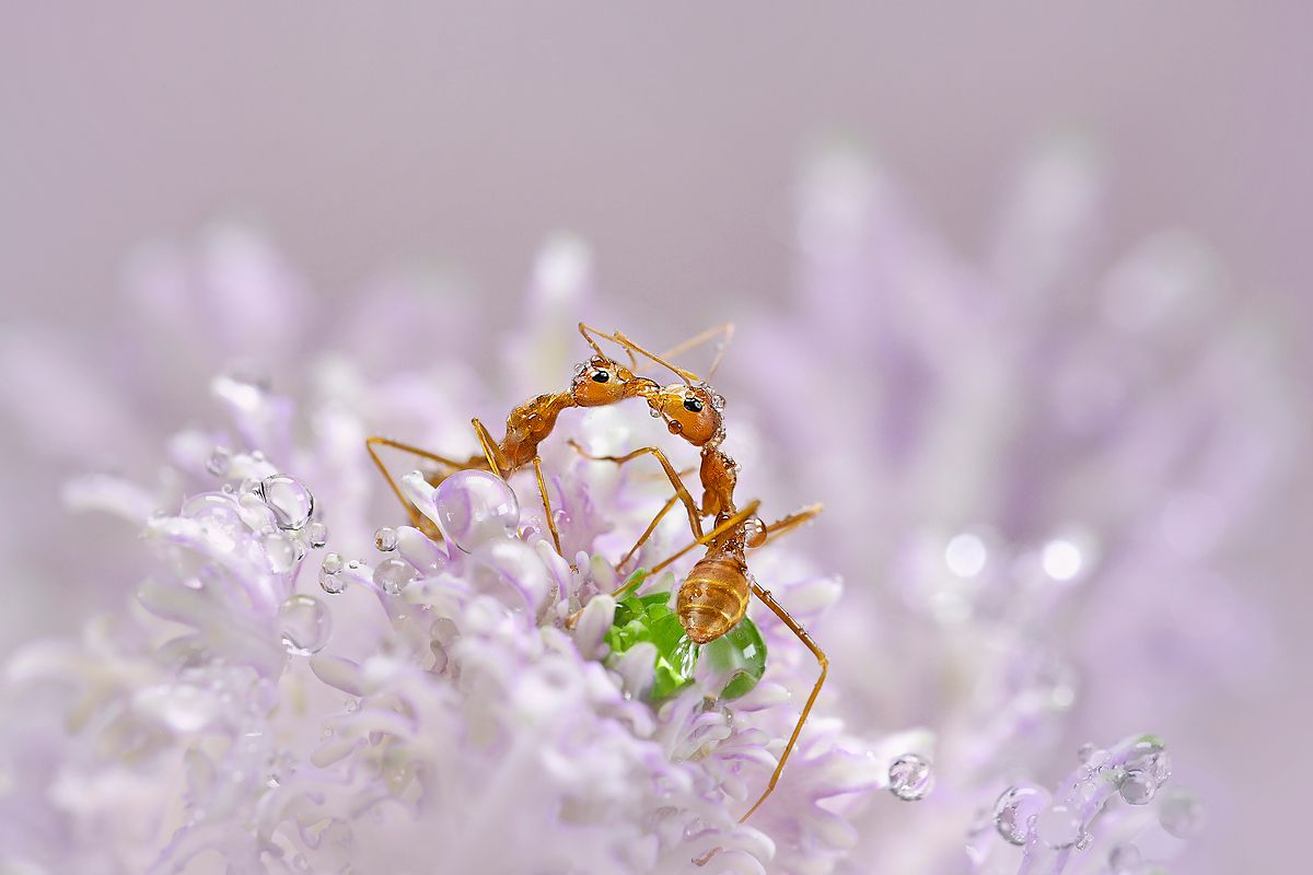 "I discovered after the rain, that the two ants met up, in what looks like a ‘romantic’ rendezvous within the flower. The water droplet refracting the foliage of the flower, appears like an emerald."