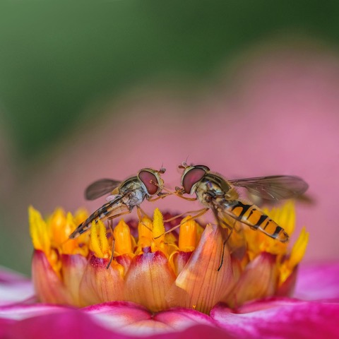 "There were an unusually large number of hoverflies in my garden this year. I spotted these two individuals, deep within a Dahlia flower, which gave the appearance of fighting over the spoils."