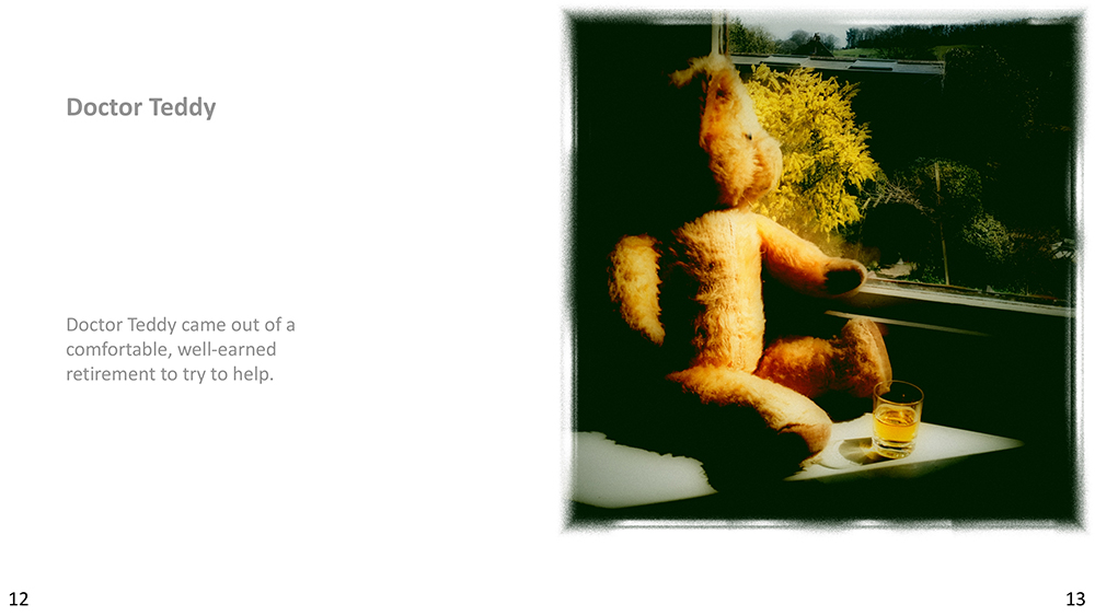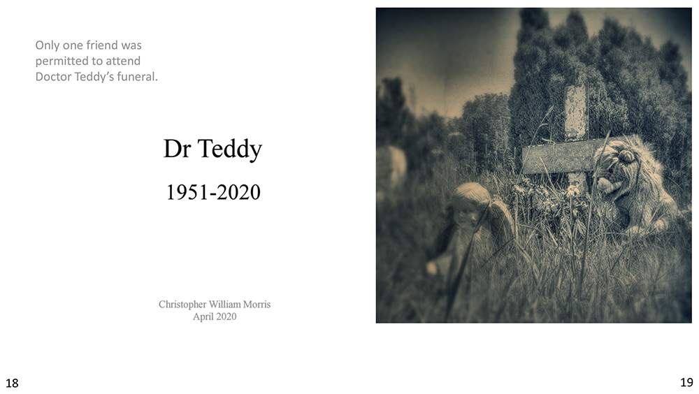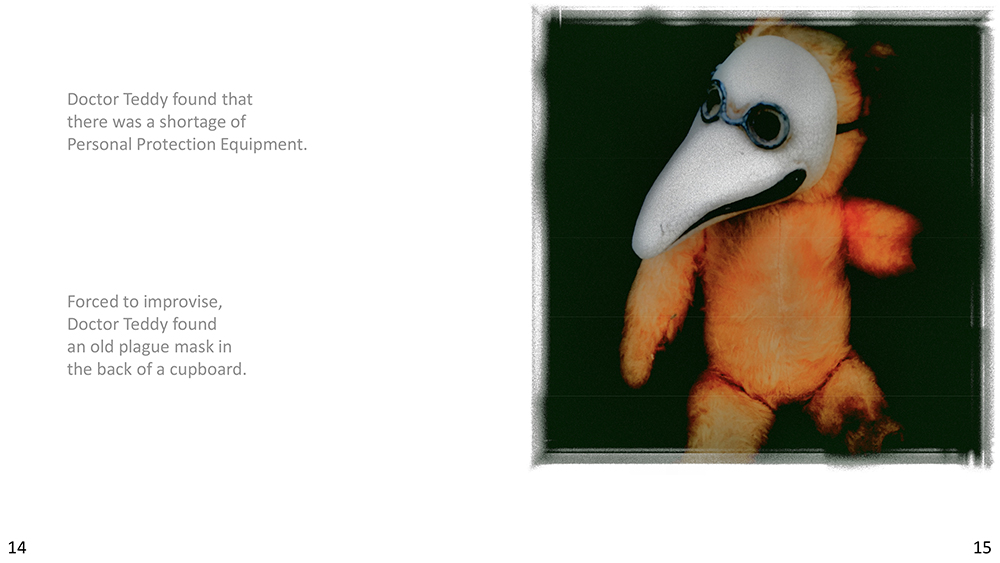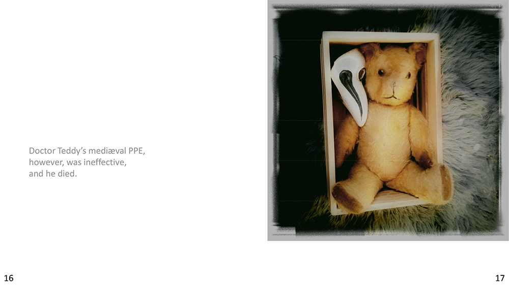 C-19 2020 is a handmade A5 book containing 30 images and a little text. The idea began with the short “Dr Teddy” sequence which I made in response to a news item in March this year about the tragic story of a retired consultant who had returned to work, only to contract and die of COVID-19. This narrative linked with concurrent reports about lack of PPE and restrictions on funeral attendees. From there I knew I had to make a book.