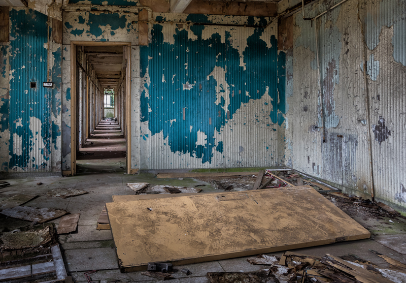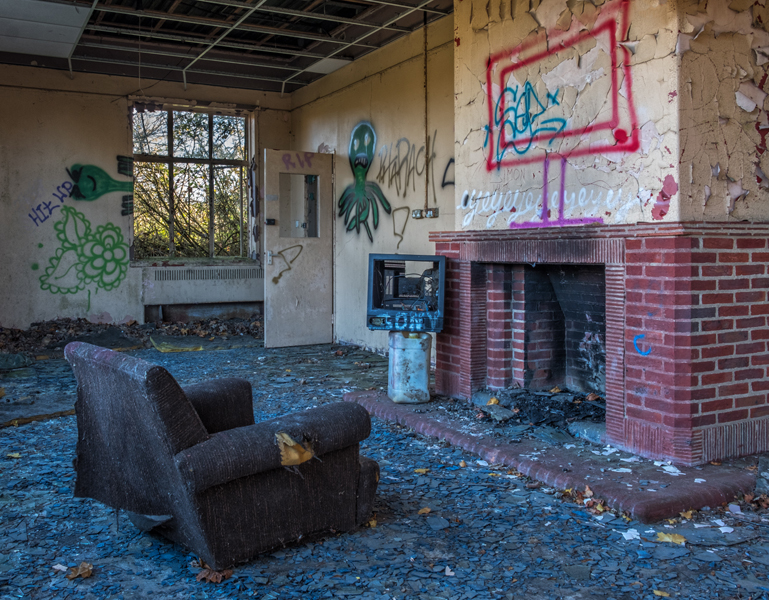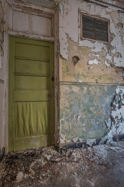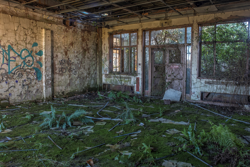 As I return to today’s reality, I am faced with detritus crunching under my feet, broken glass, peeling paint, graffiti adorning walls and signs of nature trying to reclaim it all.