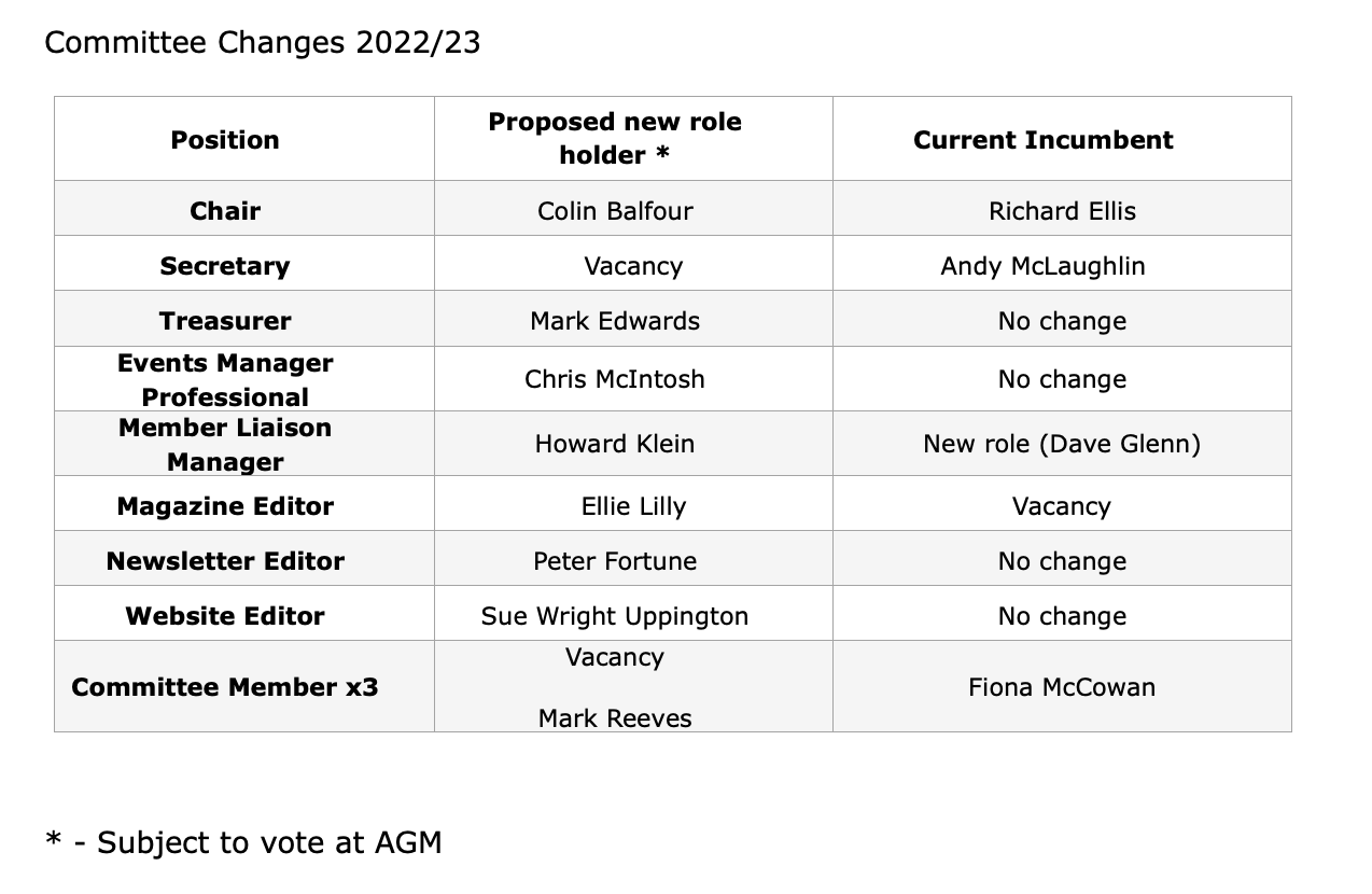 I am delighted to announce that Ellie Lilly will join the committee in the role of magazine editor and I am sure you will all join with me in welcoming her to the group. As previously advised Chris McIntosh has taken over from Mark Reeves as the manager of professionally led events.