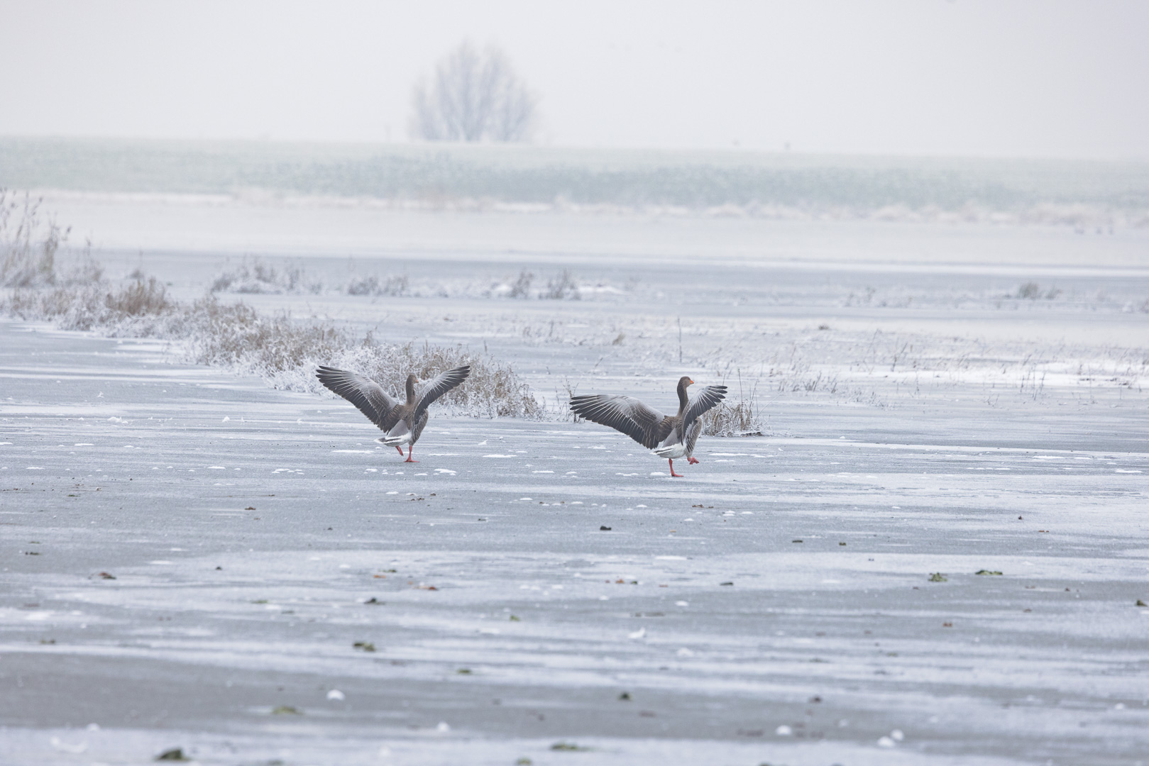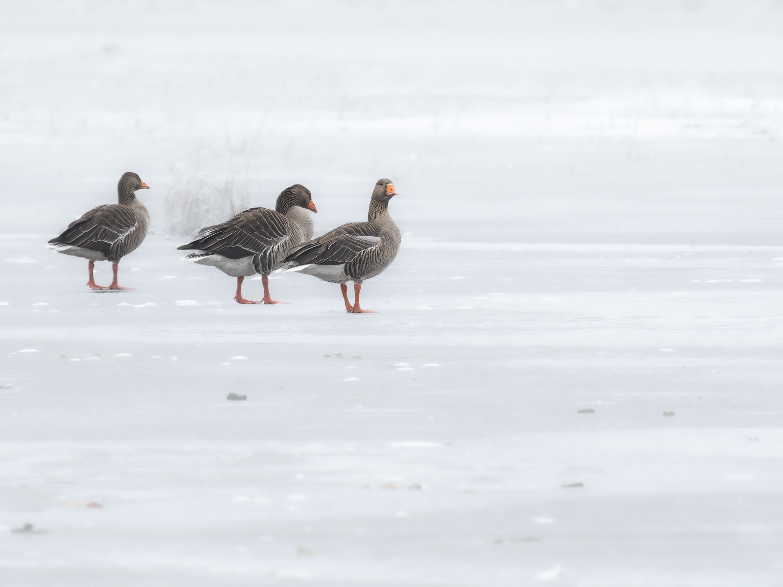 The big attraction are the Whooper Swans (Ann Miles) looking very much at home in the conditions (Dave McKay )The smaller birds looked much less comfortable like this Dunnock (Jane Moore). There were several perties of Greylag Geese including these goose-stepping duo (Dave McKay