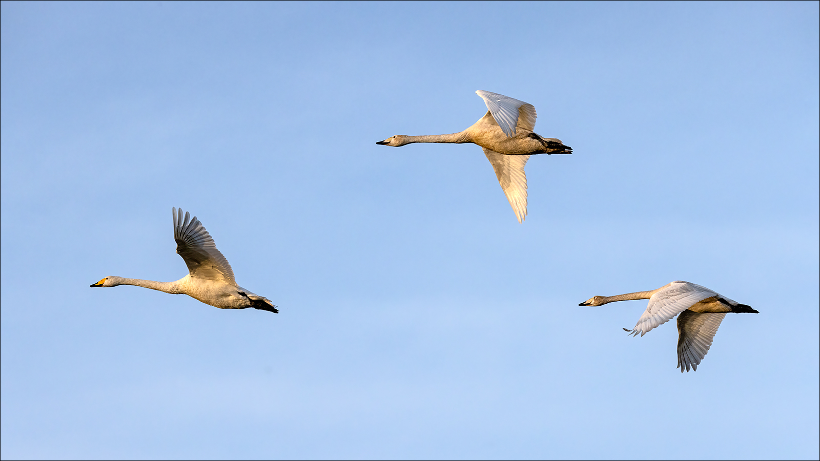 Most of the group arrived for the Swans awake event at 6.30am were rewarded with the specatcle of the full moon setting as the sun rose and a Barn Owl quartering the bank (image above and left Ann Miles. Unfortunately the wind was in the wrong direction so the swans took off away from us but a few images were taken (right: Whooper Swans by Duncan Locke)