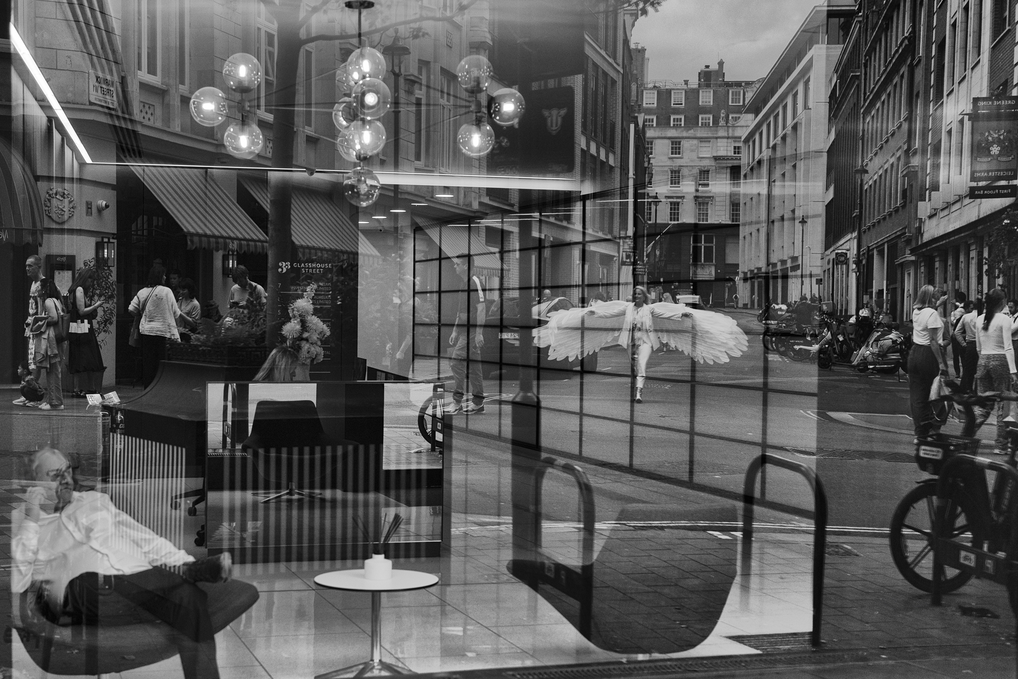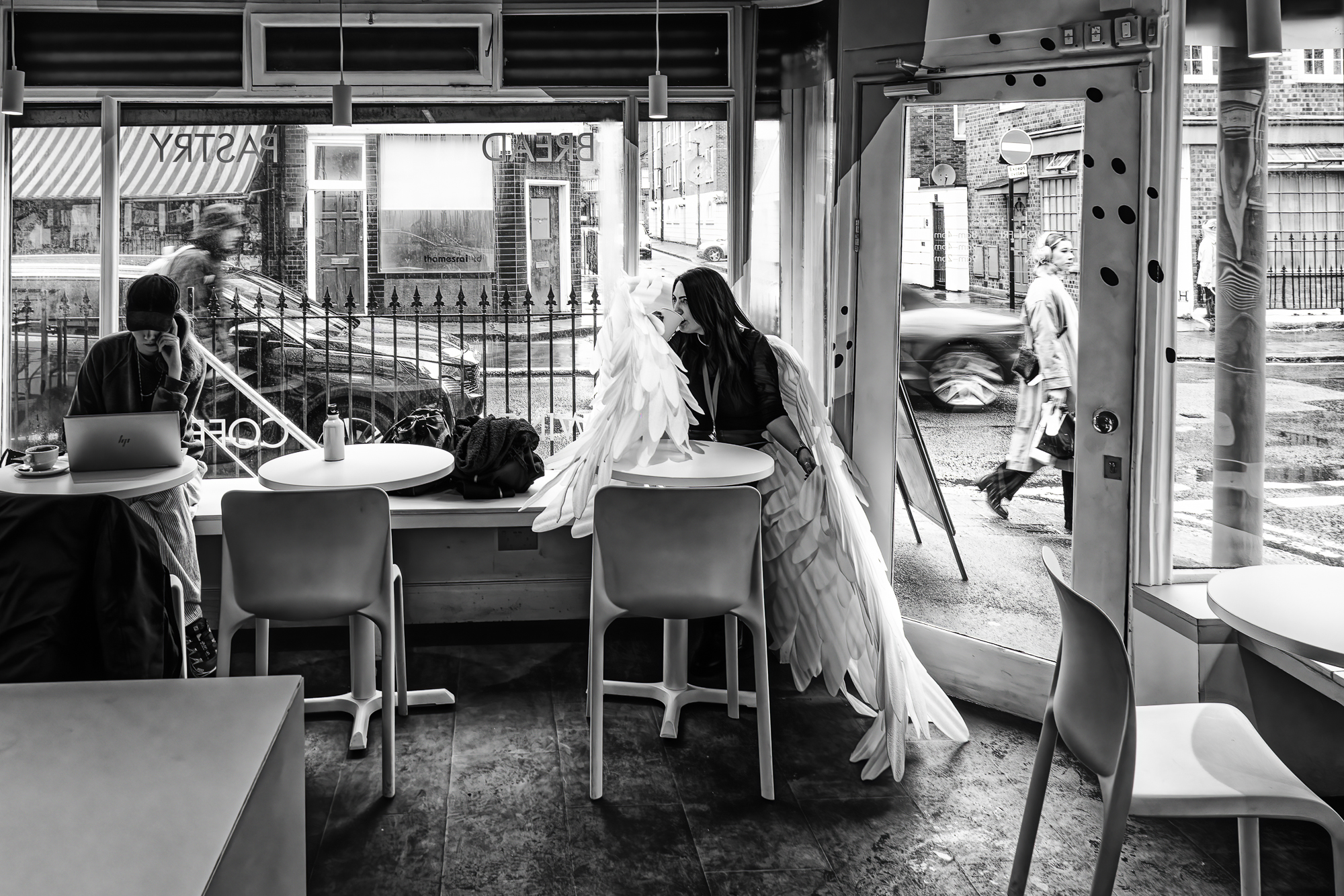 The project took nine months to shoot but from day one, it became apparent that the public were blind to the angels in their midst. Almost without exception, people did not notice the angel beside them on the tube, or in a cafe. As the photographer I was further back from my subject so I could see people’s eye line. Literally nobody noticed.