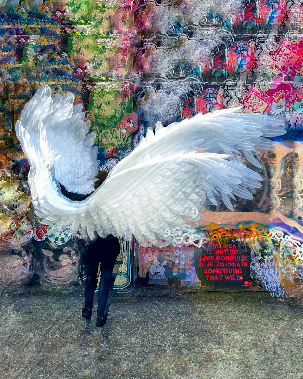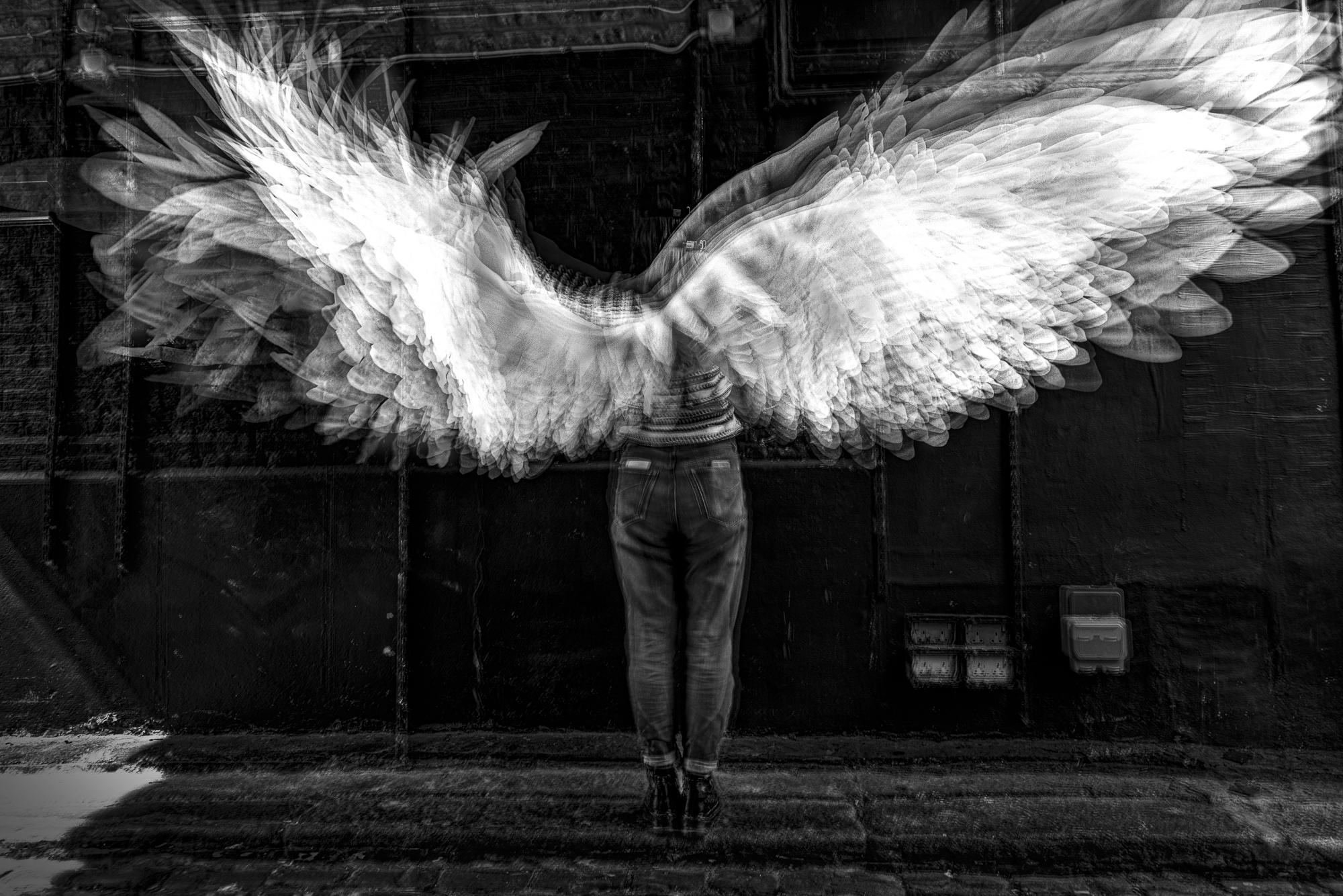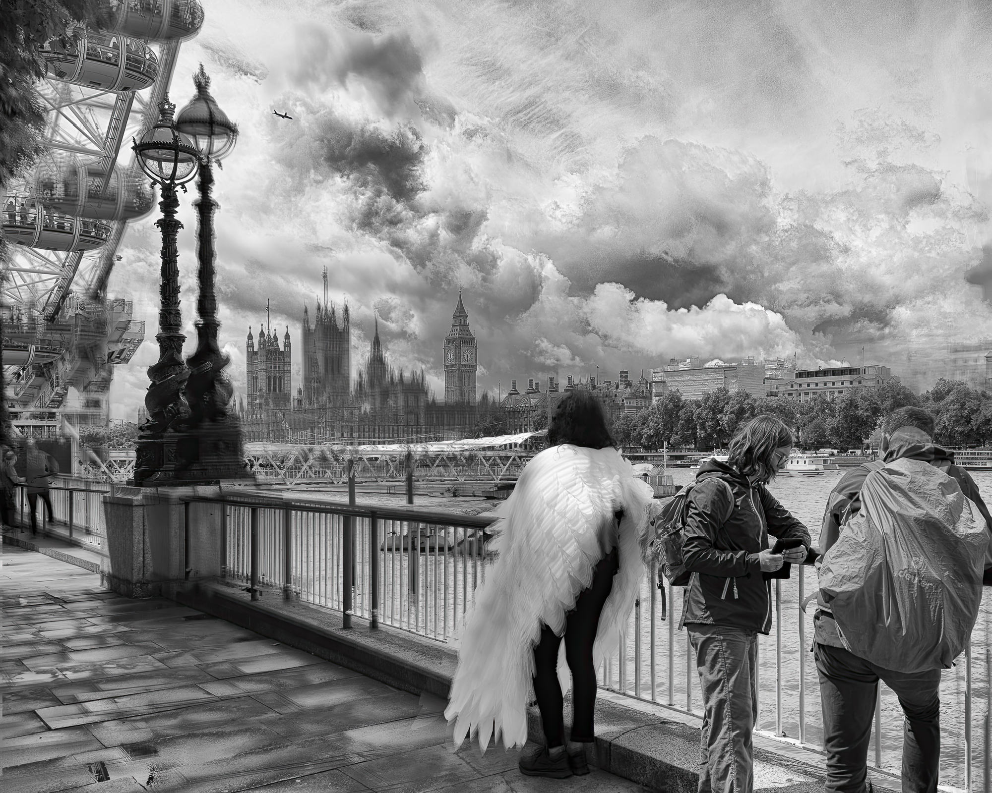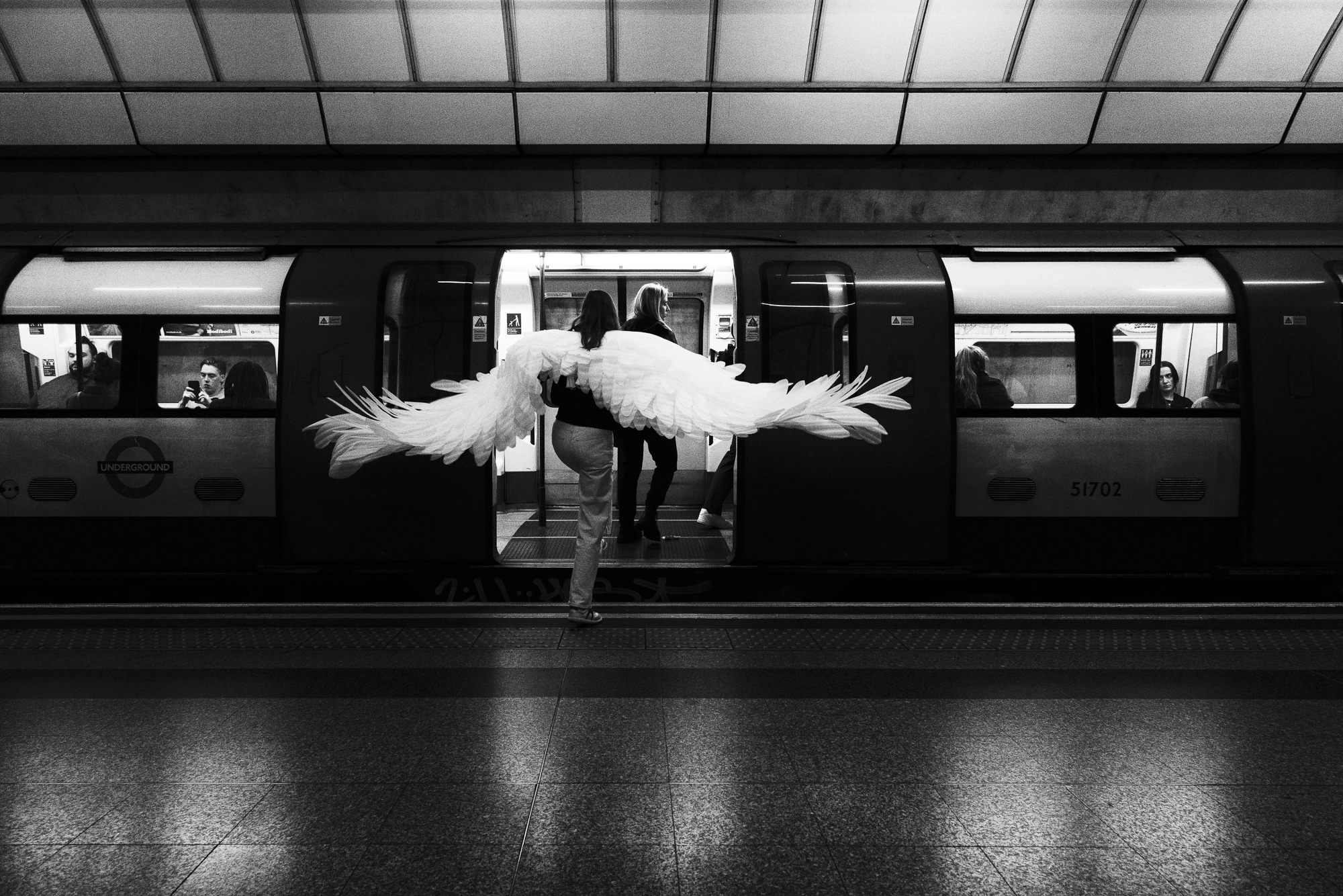 Locations were a mixture of iconic places in London given that the charity is based there, and quieter, everyday situations we can all connect to. Most importantly, each image had to tell a strong story in its own right without duplication. Managing my angels depended on how at ease the individual was wearing the wings in public. It took about 10 minutes to explain how I needed the angel to move and have a couple of practice runs with wing-flapping and walking speed. It was normally in the last few minutes of the shoot that everyone relaxed and the magic happened.