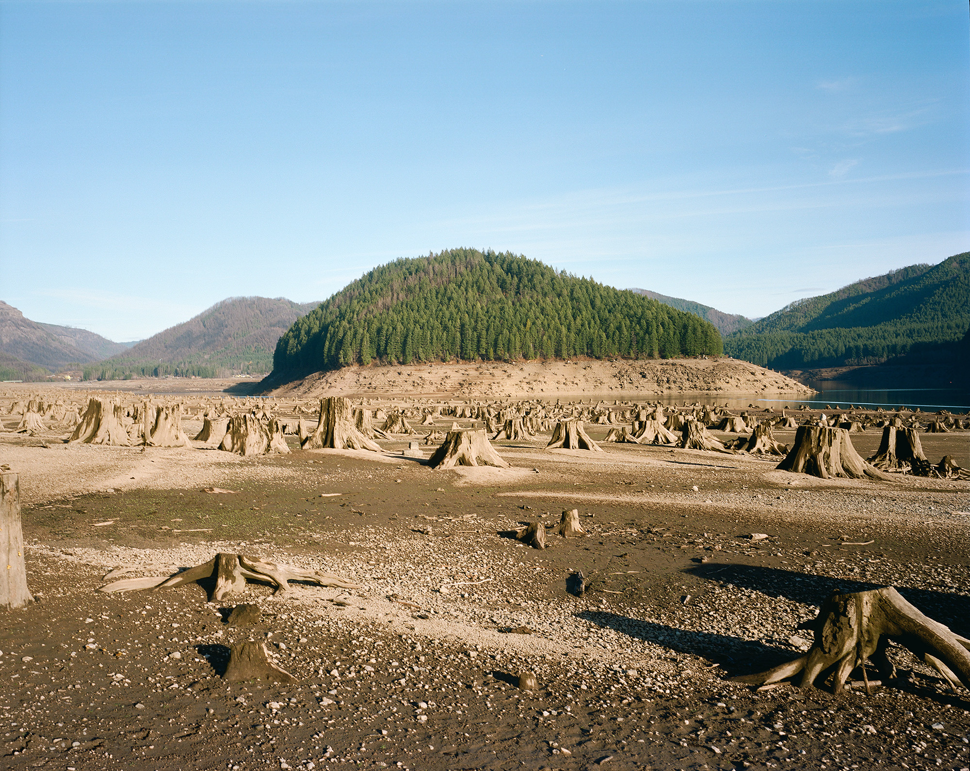 The bottom of human-made Detroit Lake, Oregon, 2021. When the water levels recede in the winter months, the stumps of the logged ancient forest are revealed.