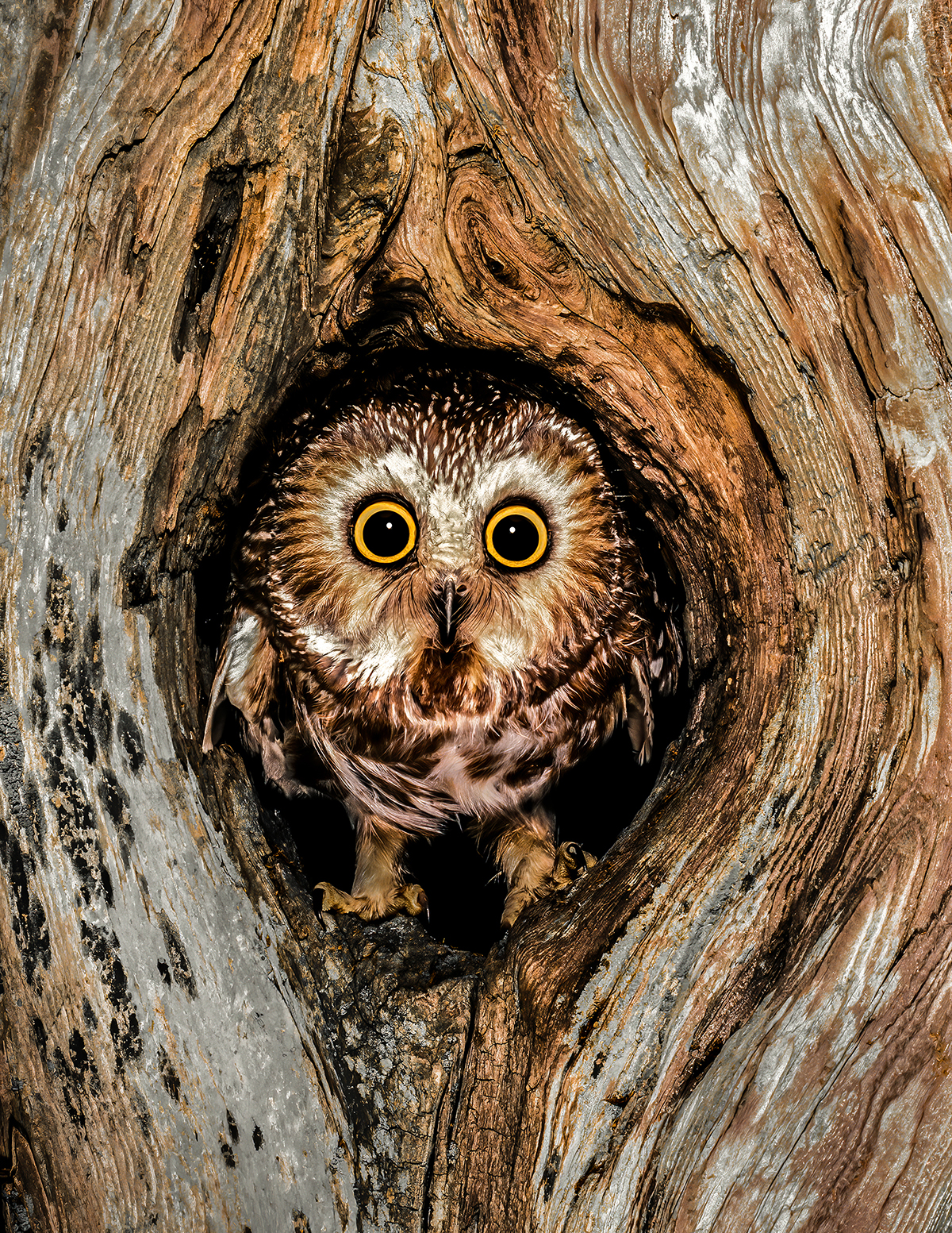 A Northern saw-whet owl (Aegolius acadicus) in Washington, USA, prepares to leave its nesting cavity after having fed its young.