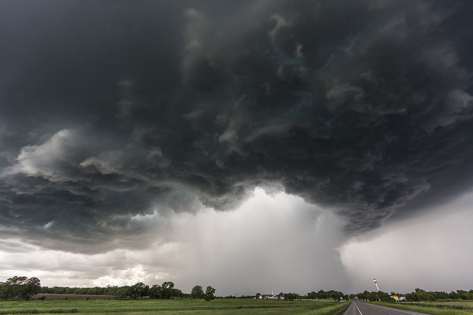 “You can tell I’m using a very wide-angle lens, because the pole for the water tower in the town is at an angle, but sometimes it’s the only way to fit the clouds into the frame. I just wanted to show what a proper downpour looks like, how powerful it is when it just dumps rain. It looks like a weird jellyfish. To be on the ground, it smells amazing – that smell right before it rains in the summer. It’s much warmer than people would imagine. Sometimes there’s thunder and lightning. It’s quite theatrical. Sometimes when people see images like this, they express how afraid they’d be in that situation. I never felt fear, only awe and respect. I respect that a piece of hail might do damage to me or our vehicle. I am in awe of the light, size and structure of the storm I am witnessing.”