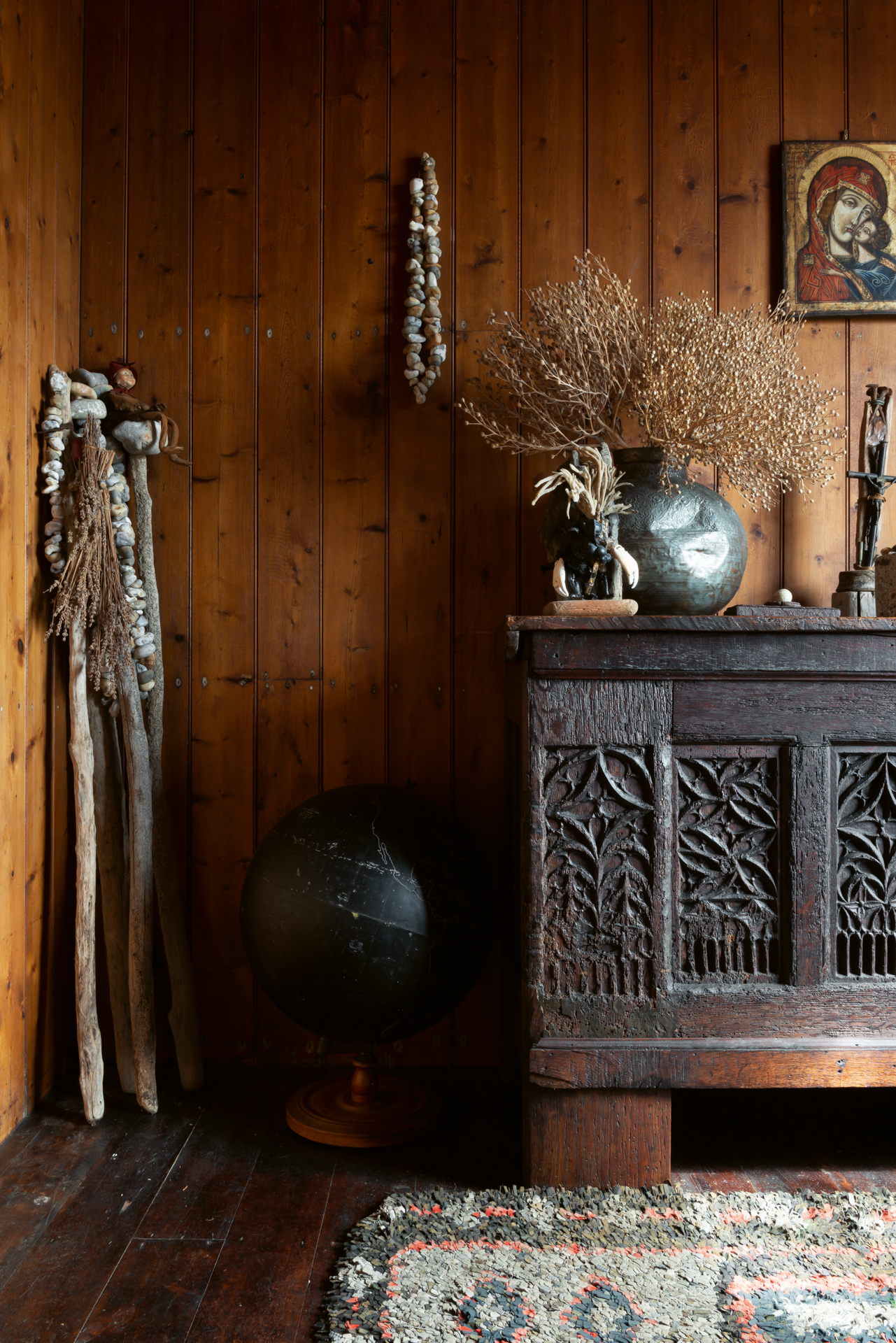 ‘Driftwood staves, or sentinels, stand in the corners – atop one sits the puppet Twinkle in the Eye’ by Gilbert McCarragher
