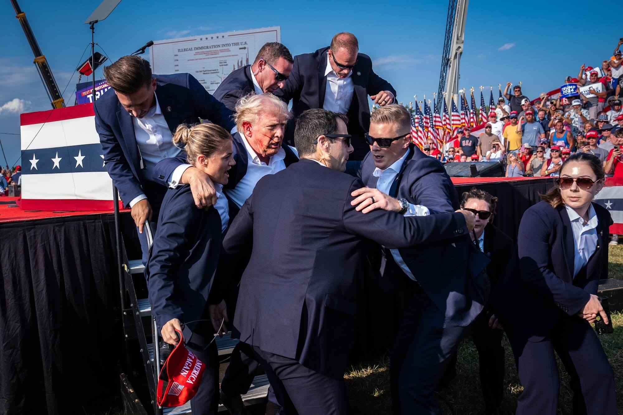 Members of the United States Secret Service help Republican presidential nominee Donald Trump off stage moments after a bullet fired by a would-be assassin hit his ear during a campaign rally. Butler, Pennsylvania, United States, 13 July 2024.