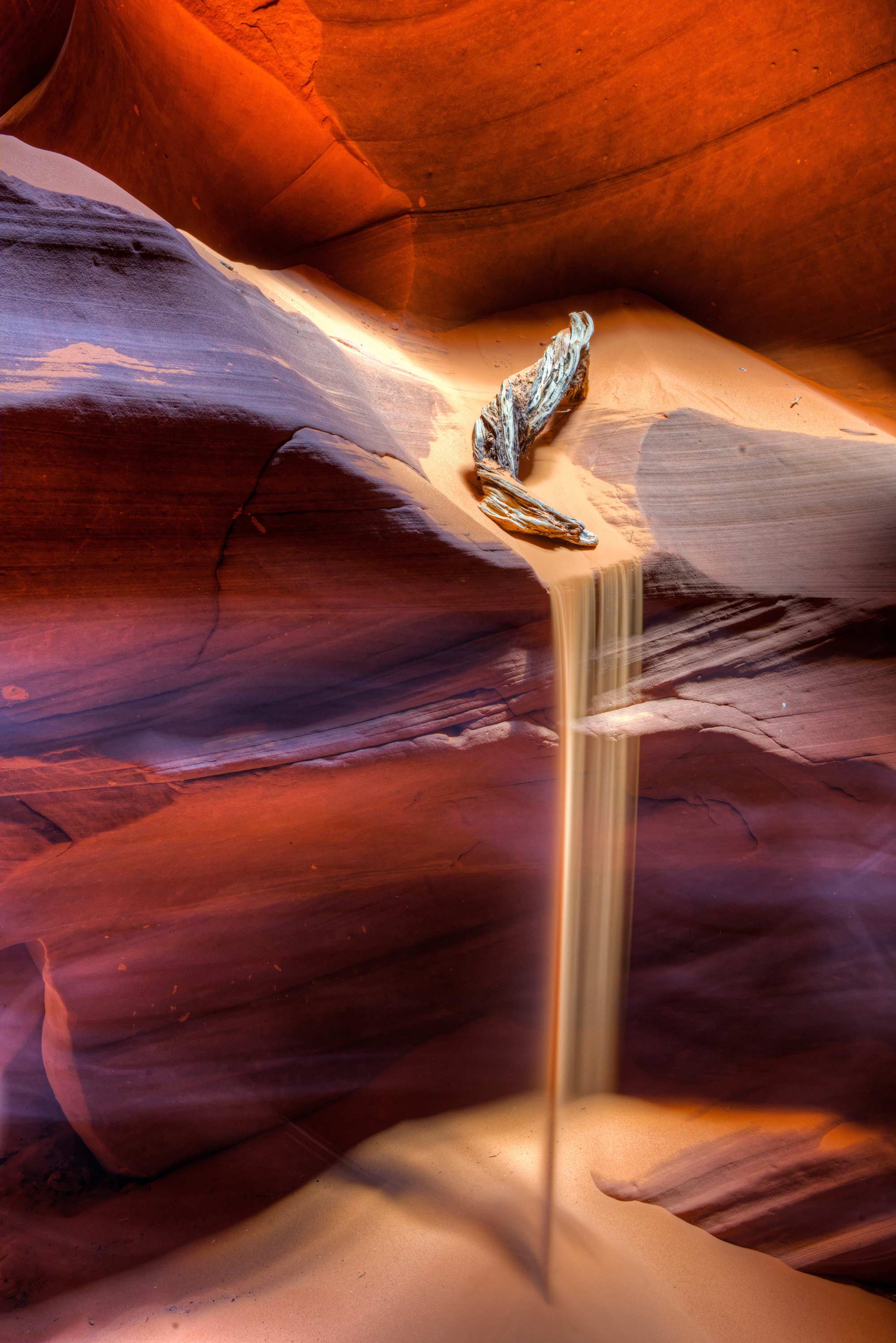 The desert winds blow sand into the narrow opening, which falls into the canyon like waterfalls. To be honest the real challenge here at Antelope Canyon was not technical, but trying to do five long time-exposures (to be combined as an HDR image) with the camera on a tripod while hundreds of tourists crashed through the narrows of the canyon (often kicking the tripod legs as they passed in the near dark). This was more like combat photography than contemplative landscape photography.