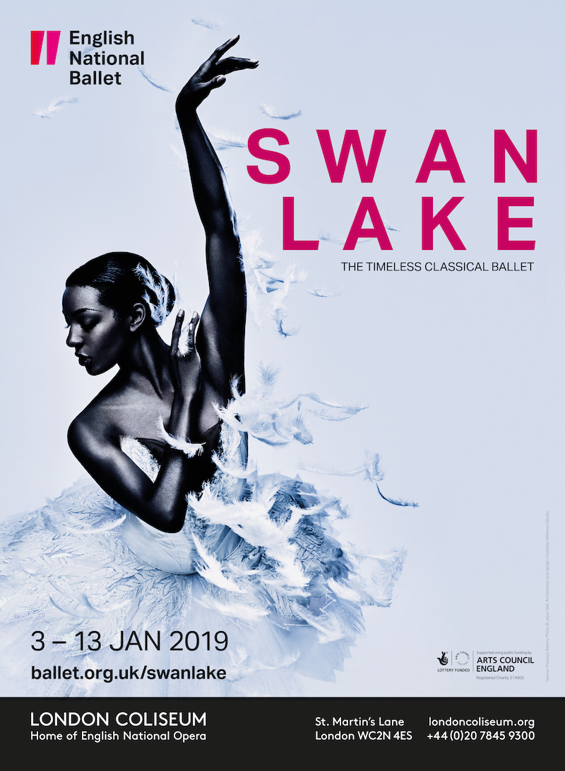 Above: Precious Adams photographed by Jason Bell HonFRPS for English National Ballet. Right: An assistant perched above the American ballet dancer provides a cascade of feathers. Below right: Poster for the 2019 English National Ballet production of Swan Lake