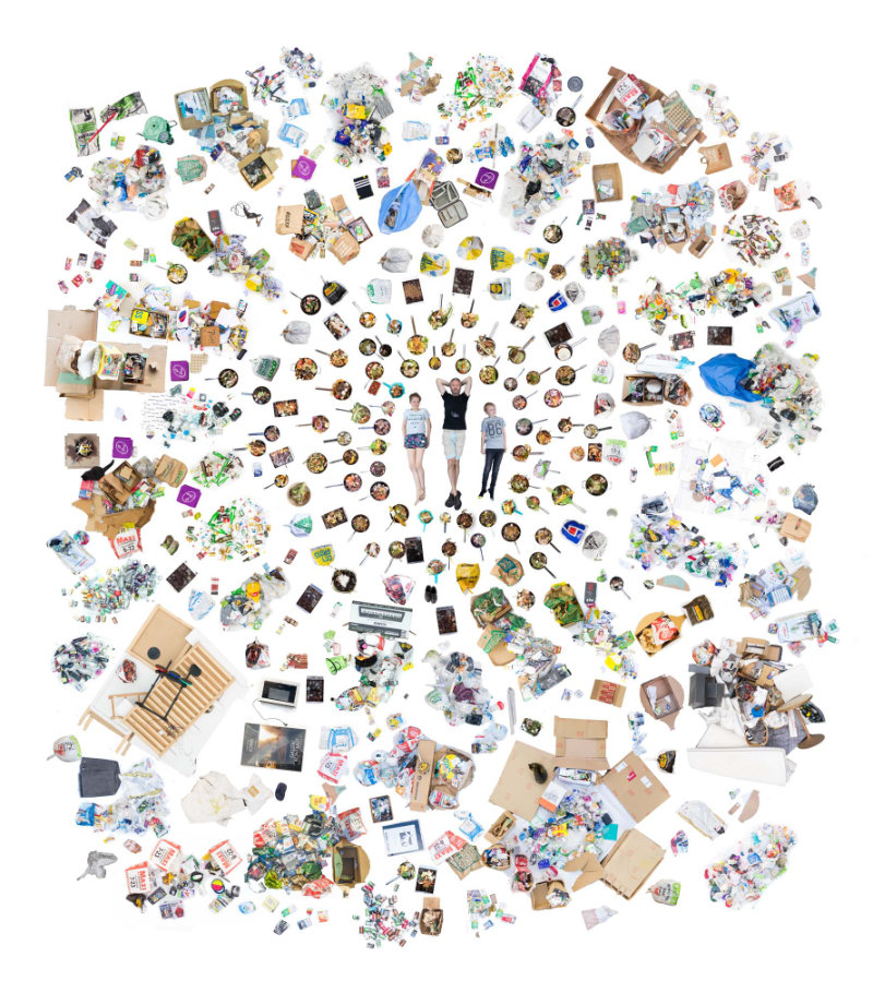 For a year Anders Andersson weighed and photographed everything he and his two children threw away. The year’s rubbish came to 499.5kg, heavier than a grand piano. He stitched together the photos into this collage showing his family surrounded by their waste. Average UK households recycle 45% of their waste.