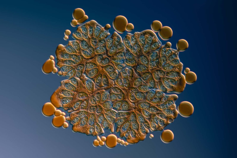 A colony of a type of toxic algae. Fertiliser run-off and rising water temperatures cause large populations, or blooms, of algae to grow. These blooms reduce oxygen in the water so fish can’t survive. However, this colony is held together by oil. Scientists are exploring growing it commercially for fuel.