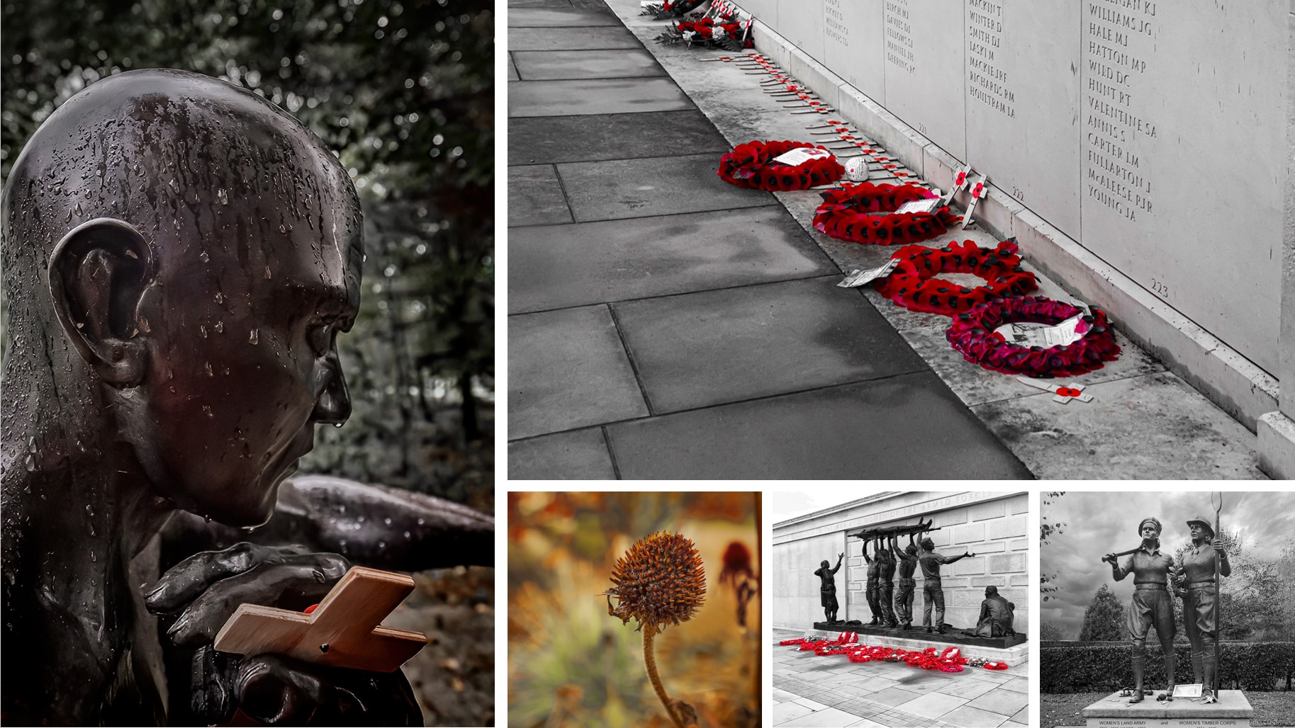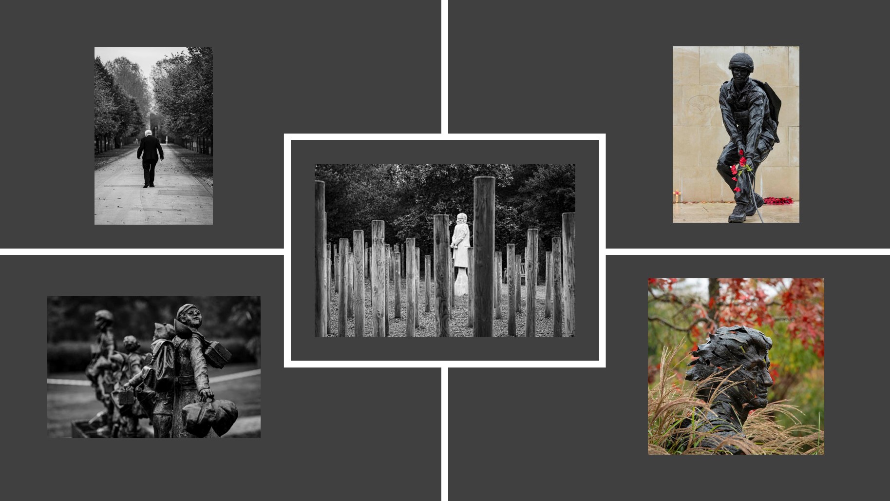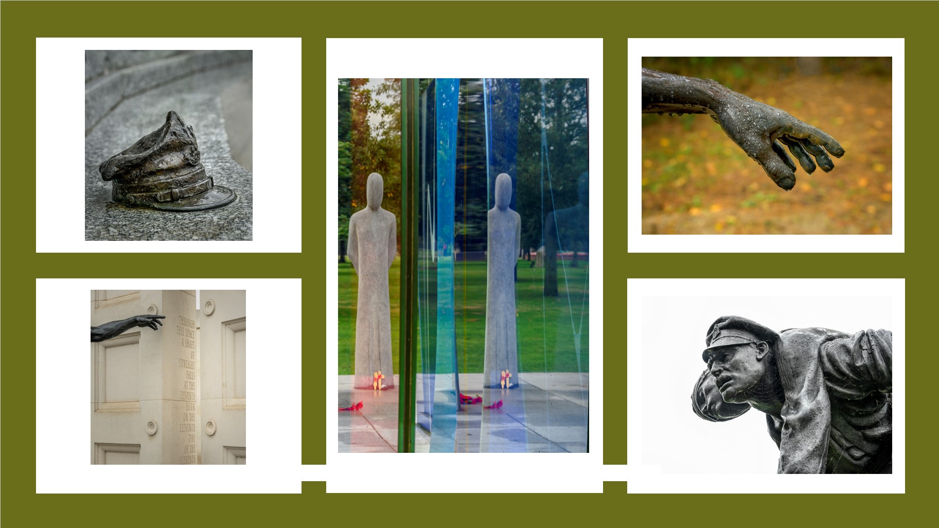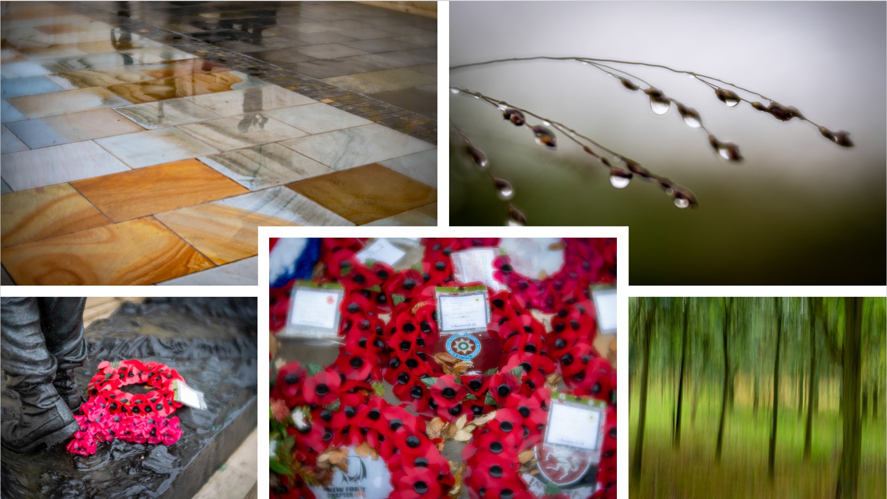 At first the rain was a bit of a disappointment but when we eventually ventured out of the café I saw how the water had clung to the memorials. My thoughts were to capture the way the rain increased the melancholic atmosphere of the sculptures . To me they became sadder than normal and the sense of loss was increased . This can be seen in the top right and left images as well as the bottom right one.